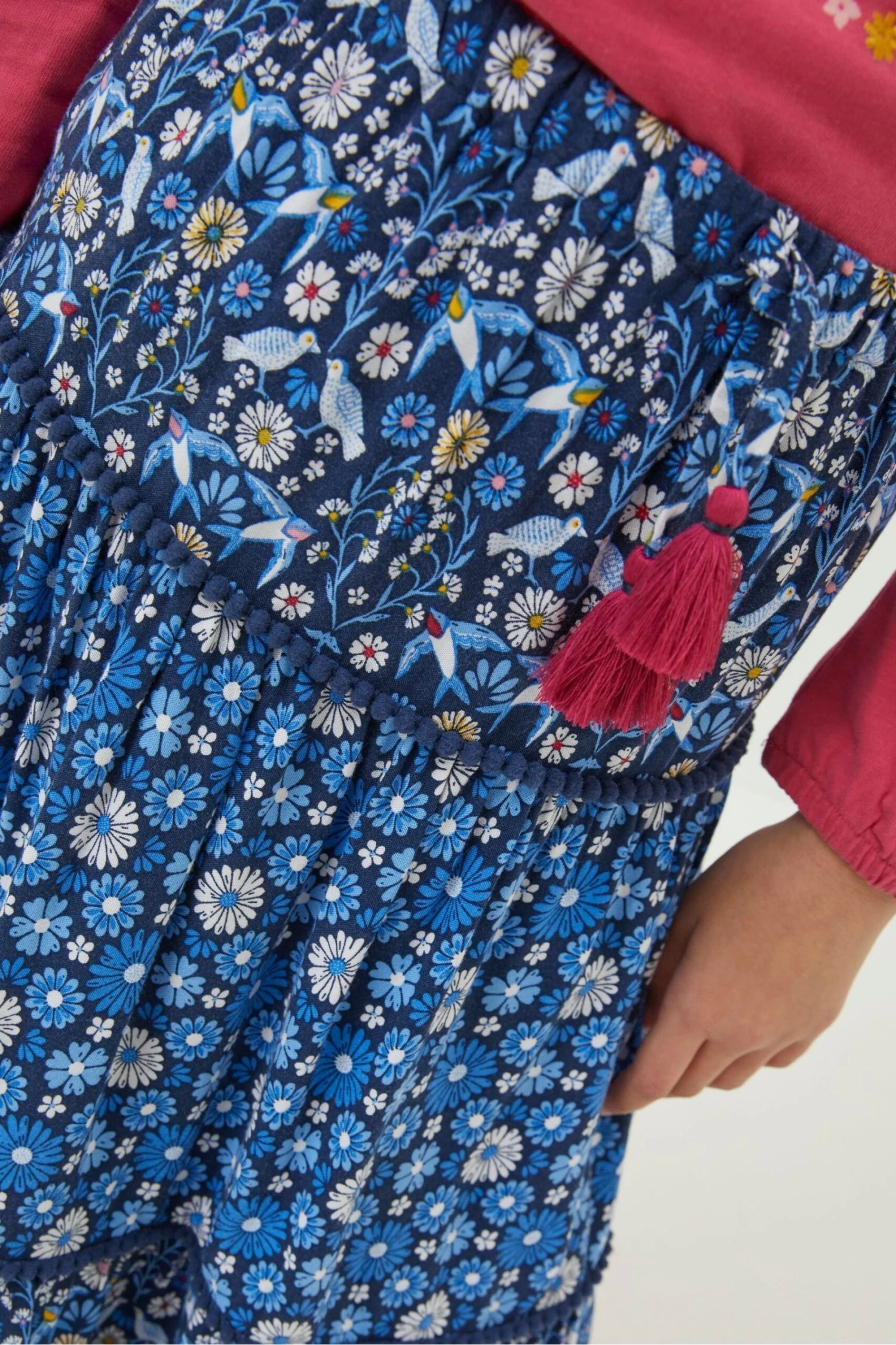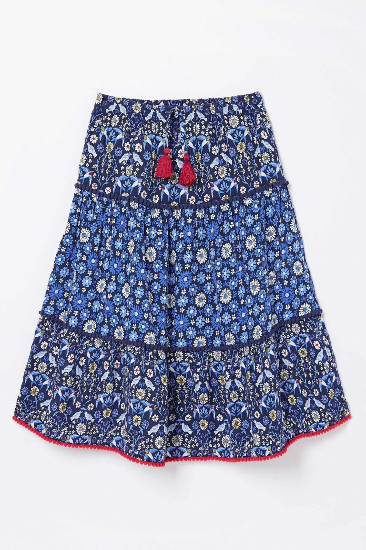 For easy style and comfort, look no further than our gorgeous Elodie skirt. Perfect for long strolls in the park or adventures in the playground, this skirt is as comfy as it is stylish. Made from a cotton-viscose blend, it features an all-over bird and floral print, drawstring waist and tiered design. Pair it with a t-shirt, cardigan and boots.
