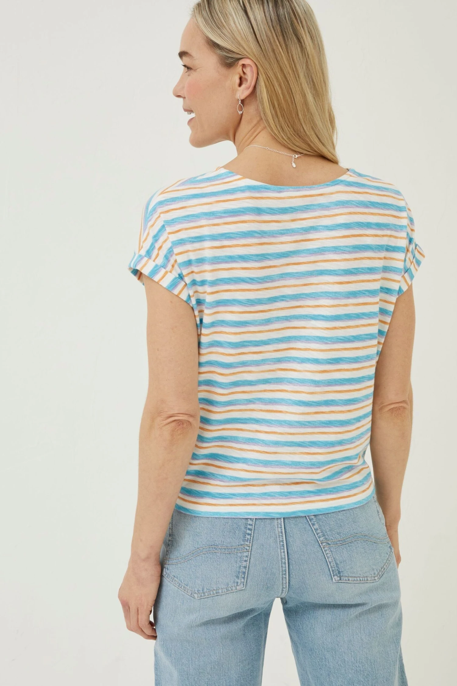 With rolled sleeves, a tie front design and in a versatile stripe print, it’s ideal for warmer weather as a quick throw-on. It’s super comfortable too and ready to take you through the season.