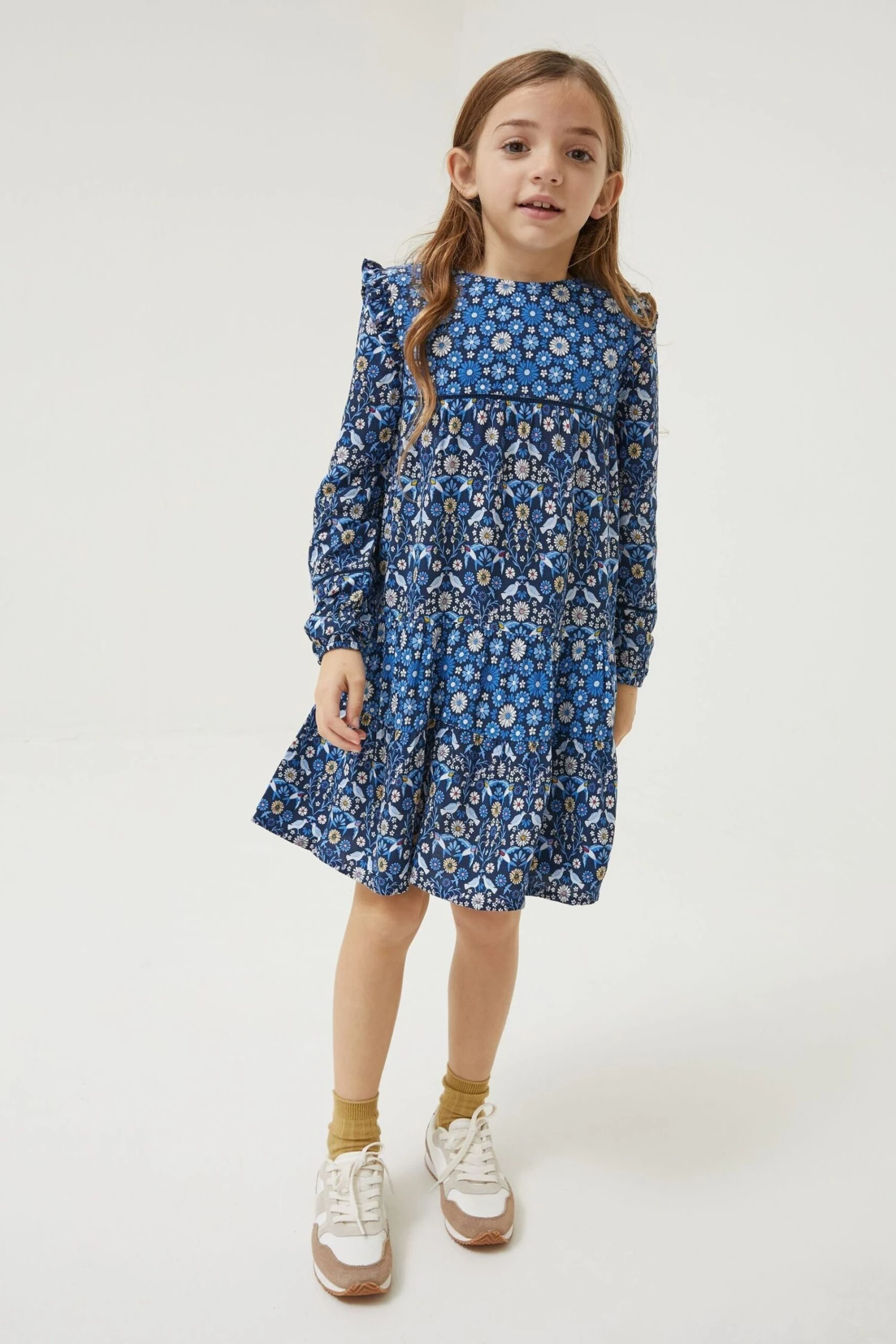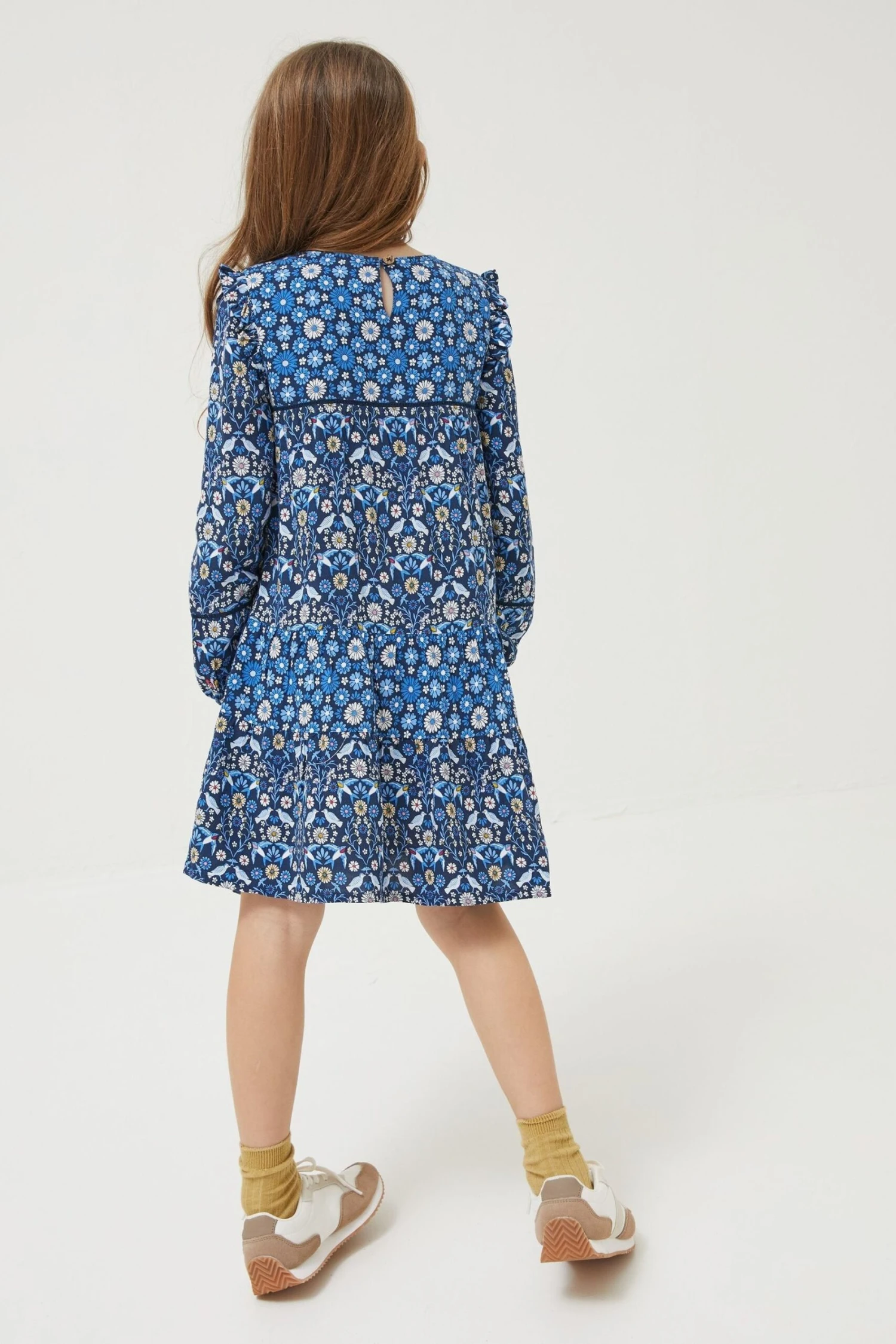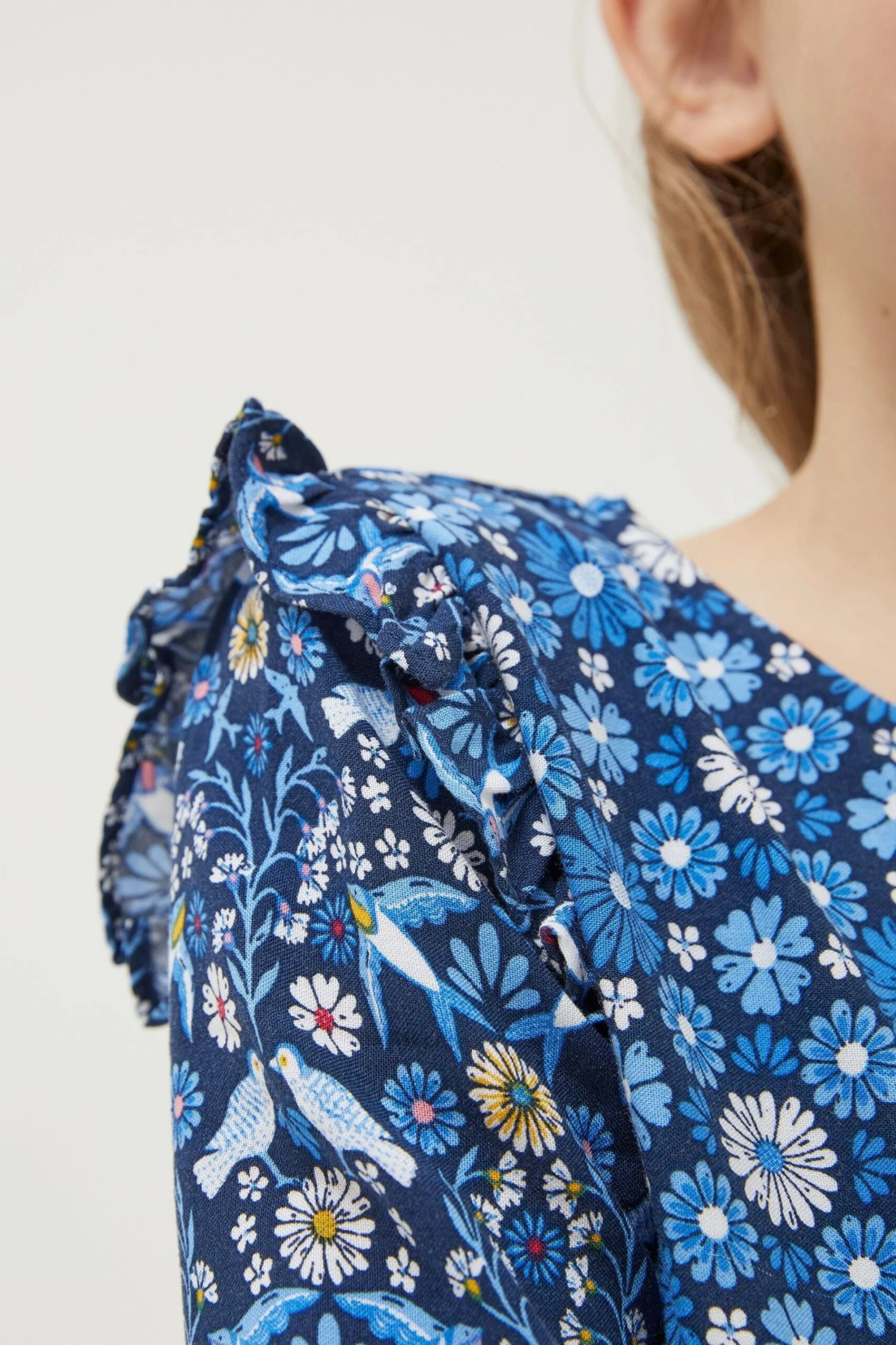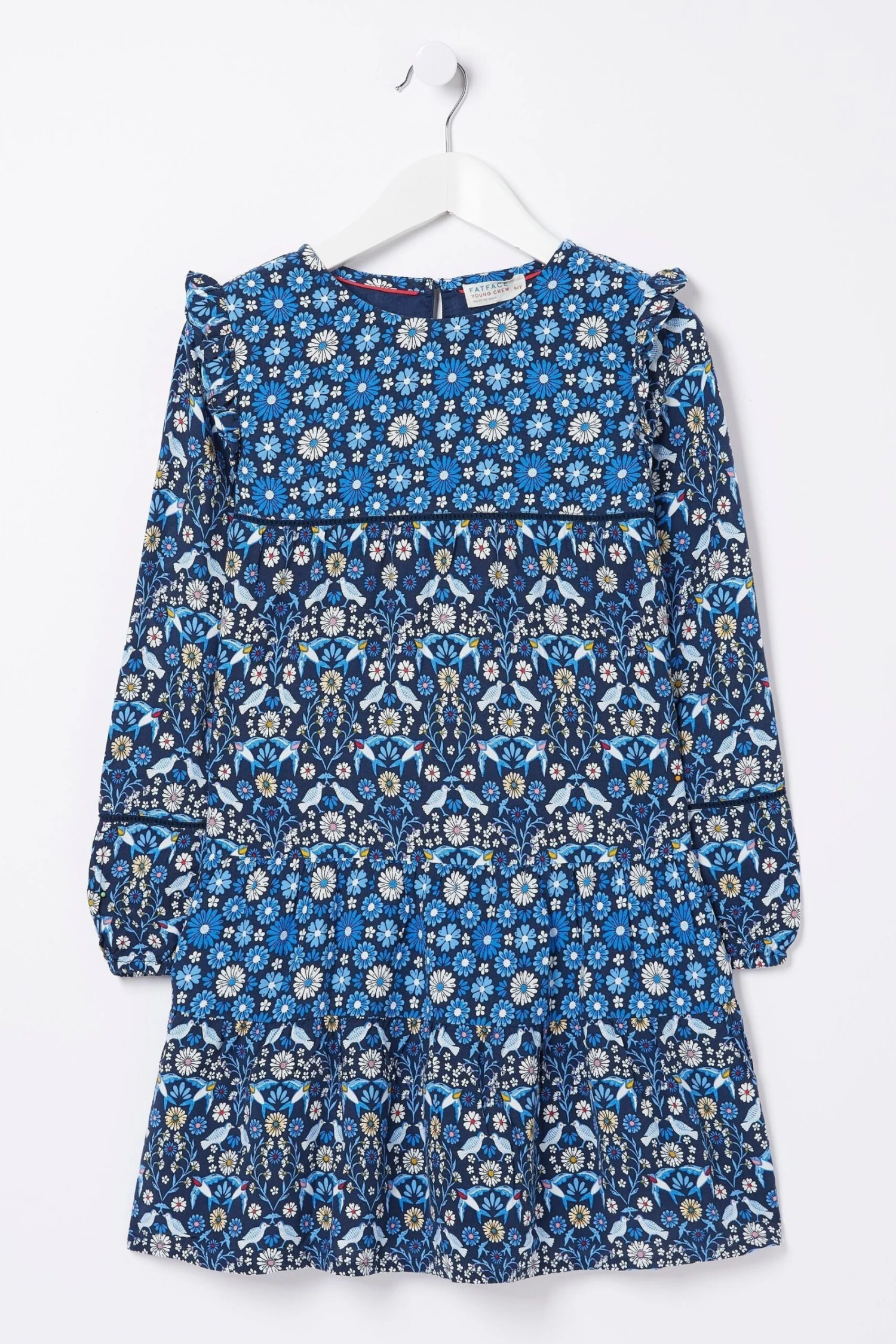 This oh-so-pretty dress is perfect for every occasion in her diary. In a calming bird and floral print, this 100% soft and comfortable dress features neck fastening at the back for easy dressing, frill shoulder detailing, and a floaty skirt design. Team it with tights and boots, and layer with a cosy knit on colder days.