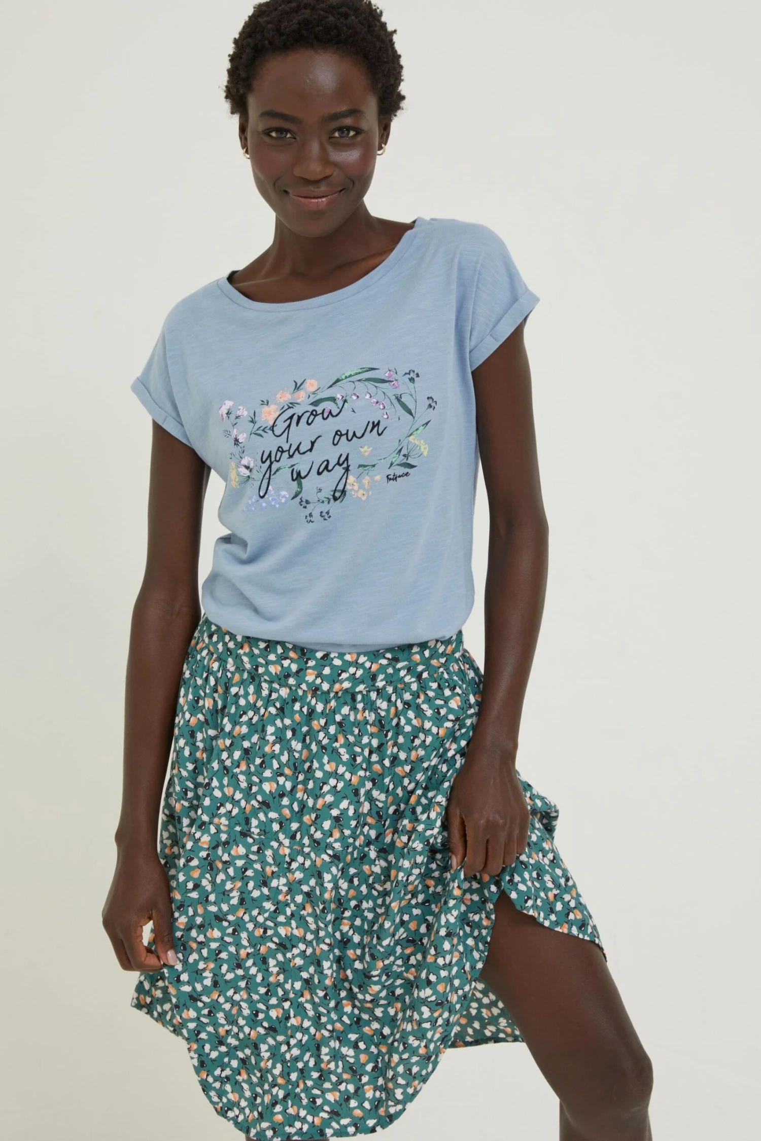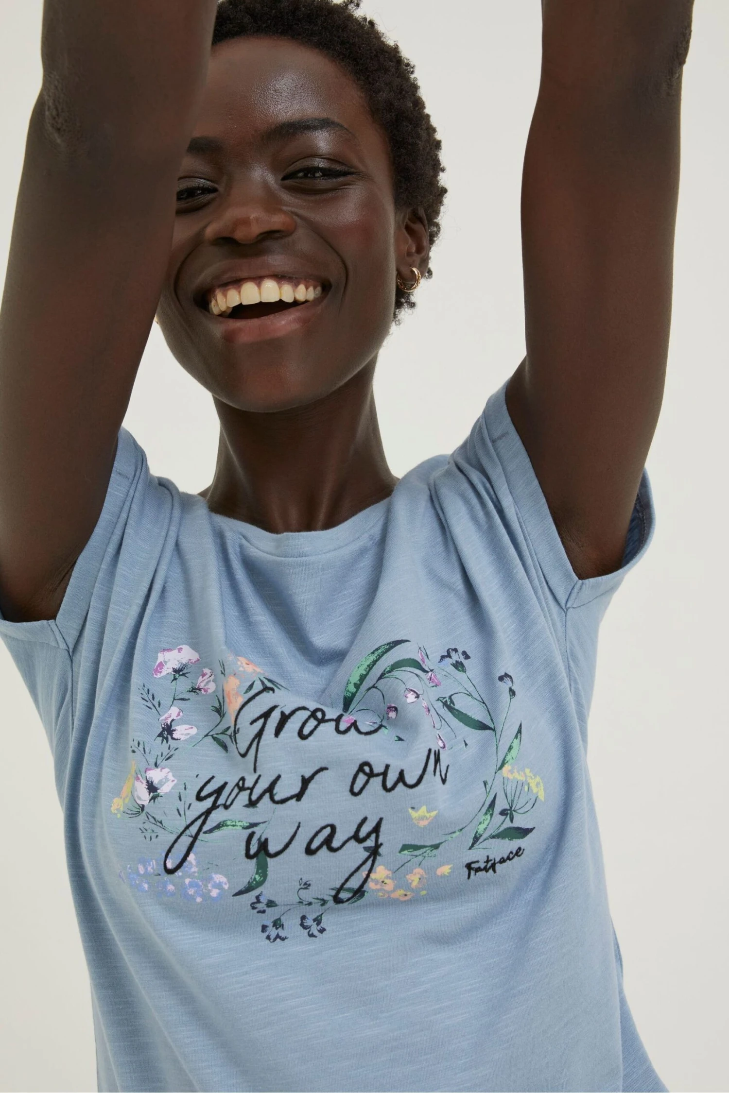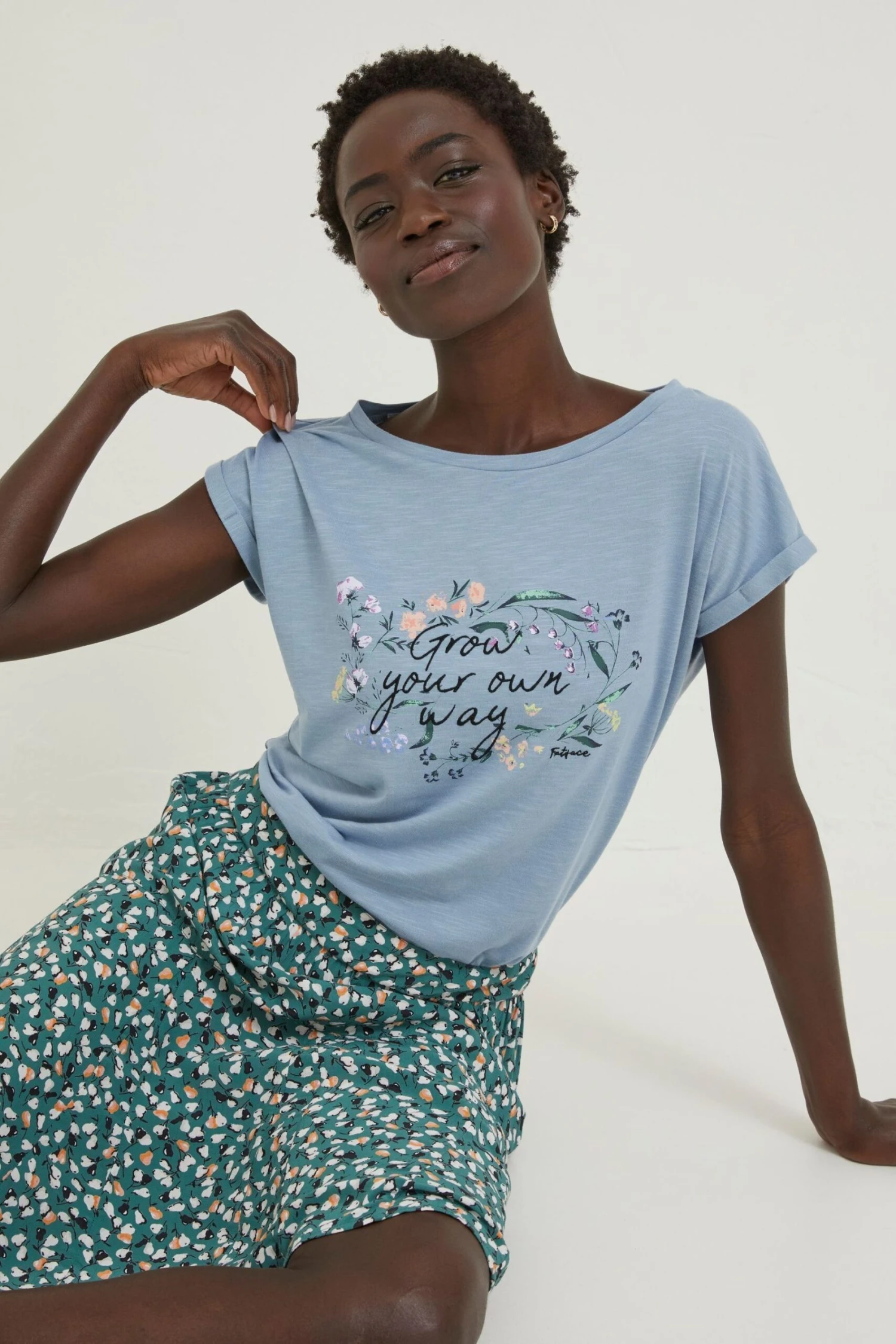Layer up your everyday look with this supersoft graphic tee. Made from a comfy cotton modal blend, it comes in a relaxed fit with short sleeves, a crew neck and a ‘Grow Your Own Way’ slogan print. Pair with jeans and trainers, and layer with a cardigan on chilly days.