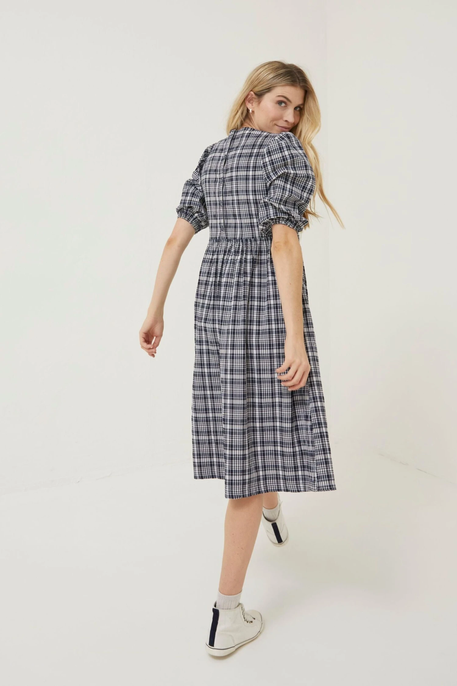 Get ready for your next new season favourite. Our Hannah midi dress has landed and waiting to be styled by you! Featuring a super flattering v-neckline, elasticated cuffs creating a gorgeous puff sleeve and an elasticated waist for a beautiful, fitted feel. Made of a super soft cotton polyester blend, you can be comfortable all year long and look the part too. Go from day to night and pair with chunky boots and a light overcoat for an ultra-trendy look.