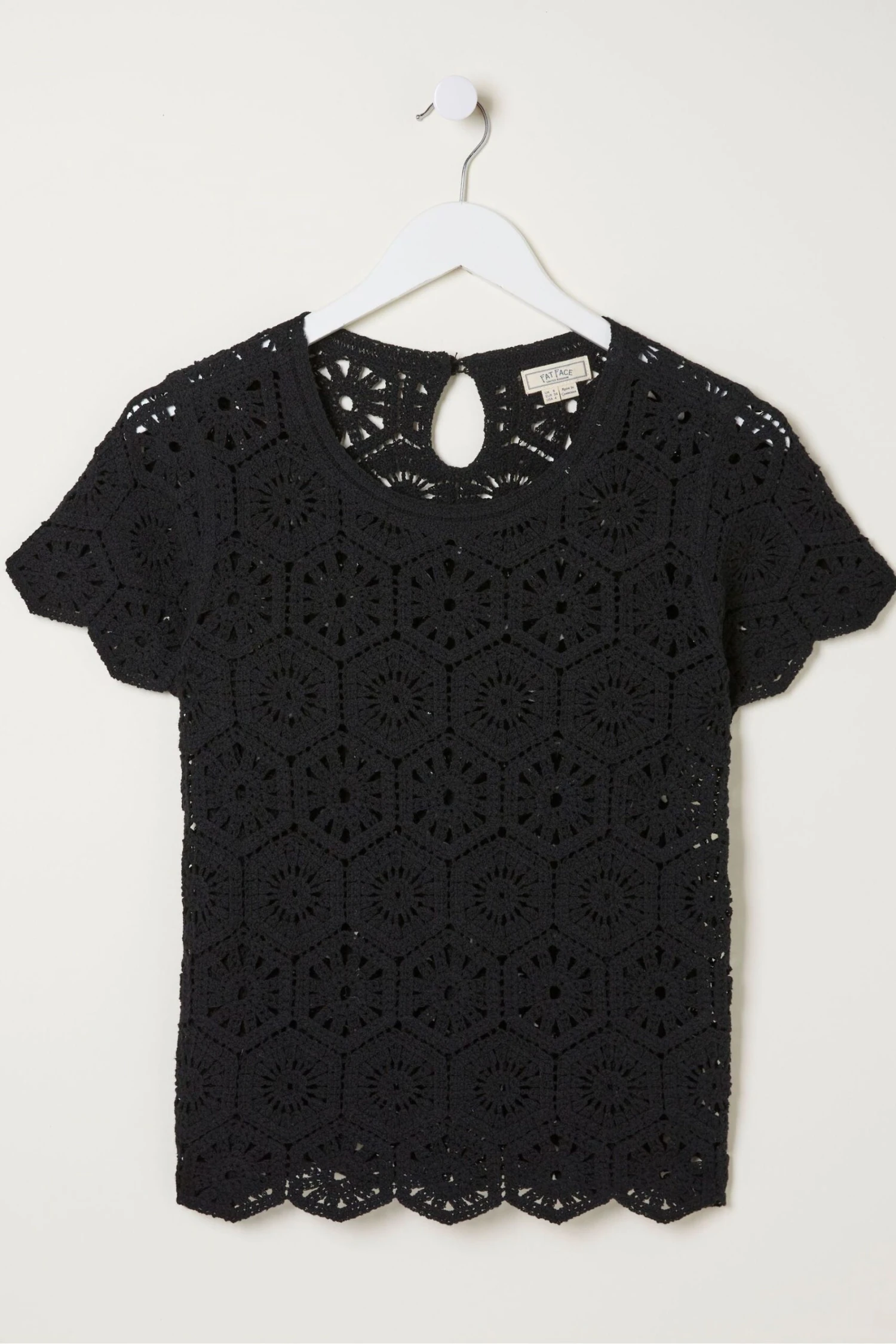 Alongside its intricate detailing, this crochet black top comes in a flattering fit with a crew neck, short sleeves, neck fastening and a pretty frill hem.