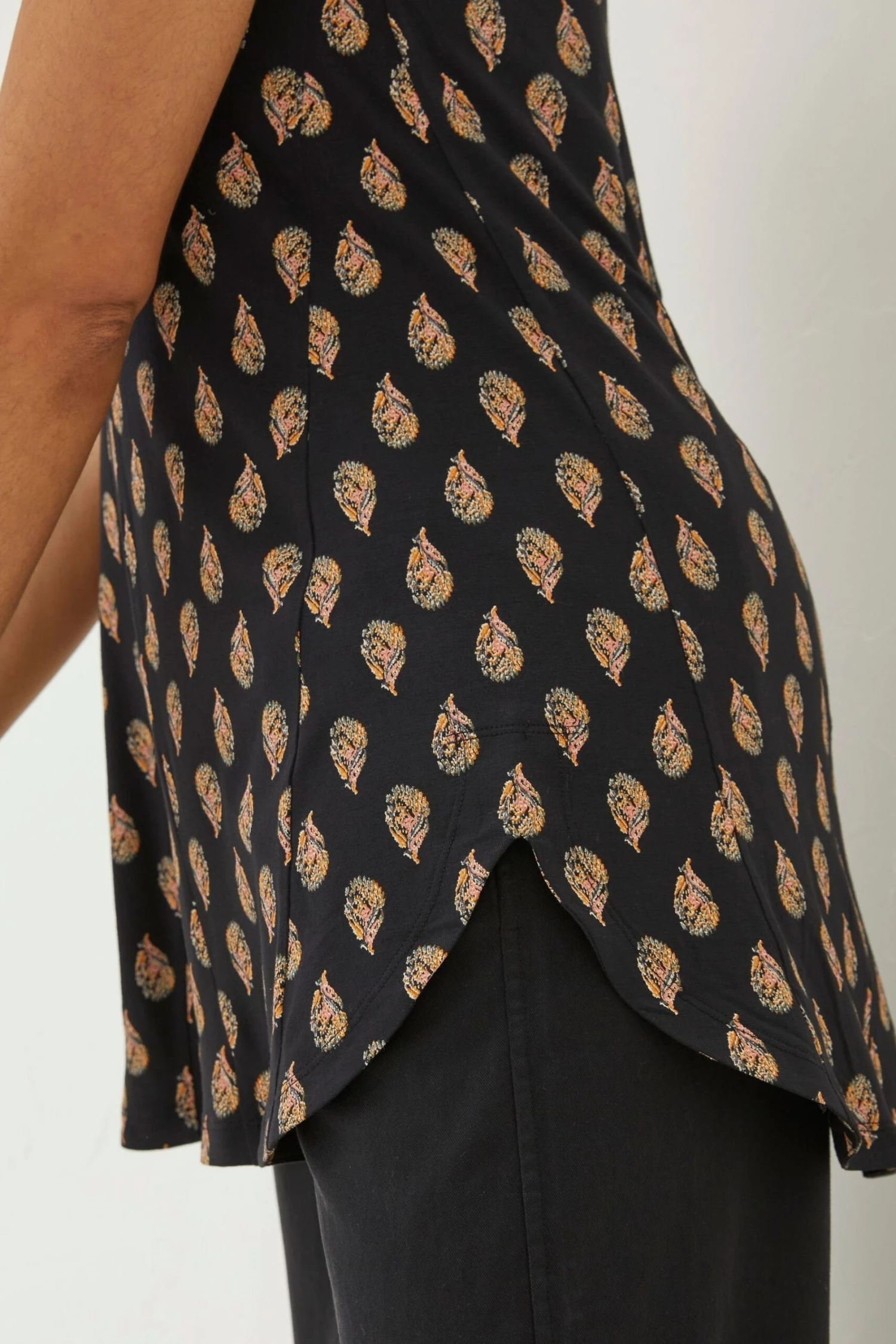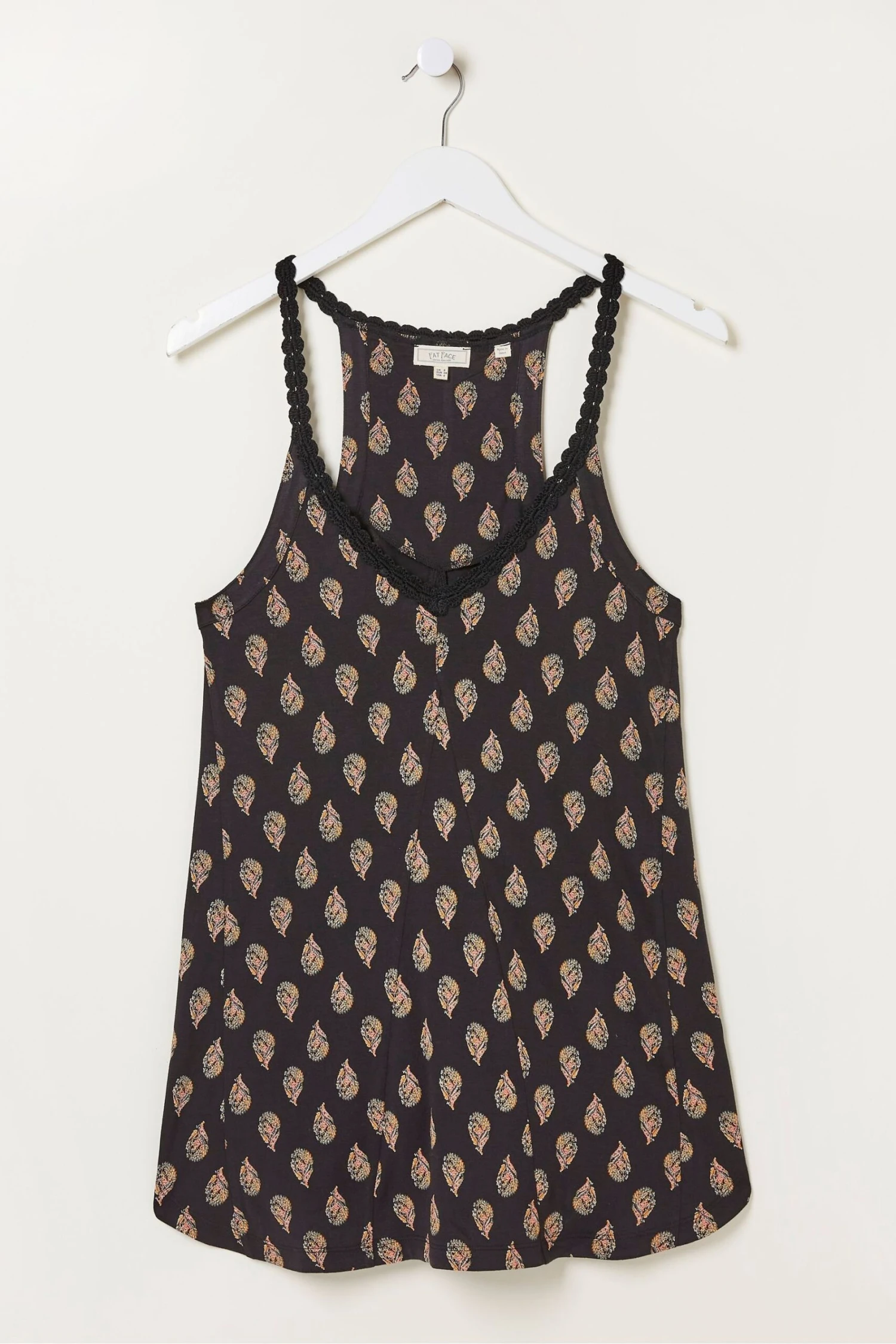 In a flattering fit, this top comes in a longline design, and features a deep neckline with embroidered detailing on the straps and an all-over woodblock print.