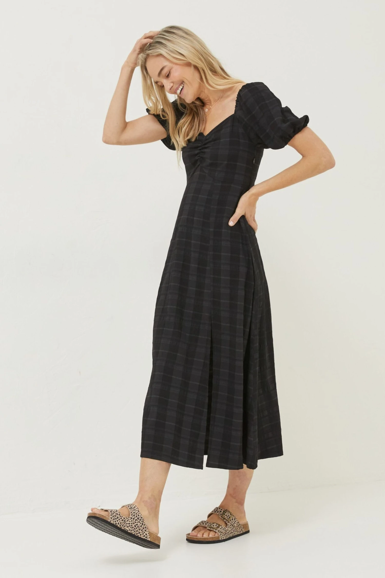 A different occasion calls for a different black dress! Boost your collection this season for a foolproof way to wow the crowds with our Tania. Made in our soft-to-the-touch polyester-viscose blend, she’s brimming with details to make you fall in love! Featuring a shirred chest detail on a sweetheart neckline, elasticated sleeves to create a slight puff and a super subtle check print for an added touch of cool. She’s gorgeous on her own for soaking in the rays or layer for slightly cooler evenings with a light knit and boots.