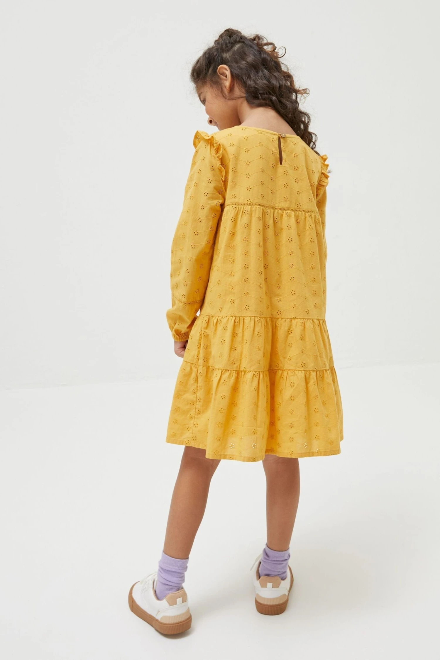Brighten up her everyday look with this super pretty broderie dress. Perfect for twirling, this comfortable dress is made from supersoft cotton and features frilly shoulders, broderie detailing and a tiered skirt design. Layer it with tights and a chunky knit, and complete the look with boots.